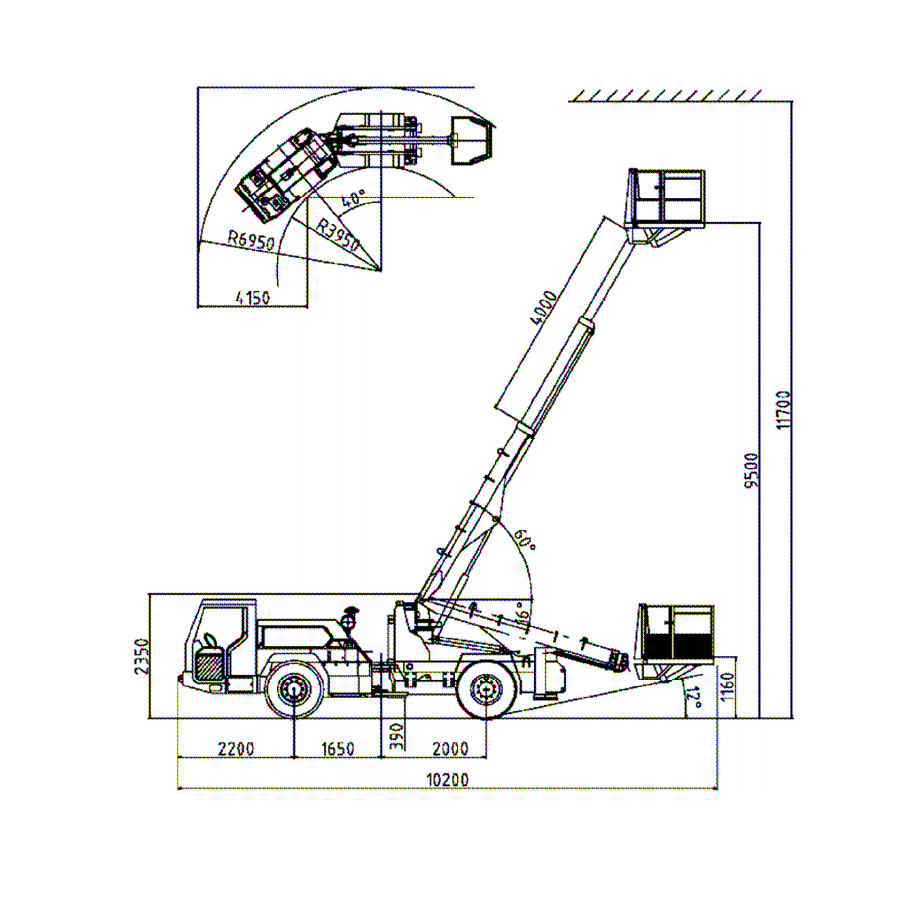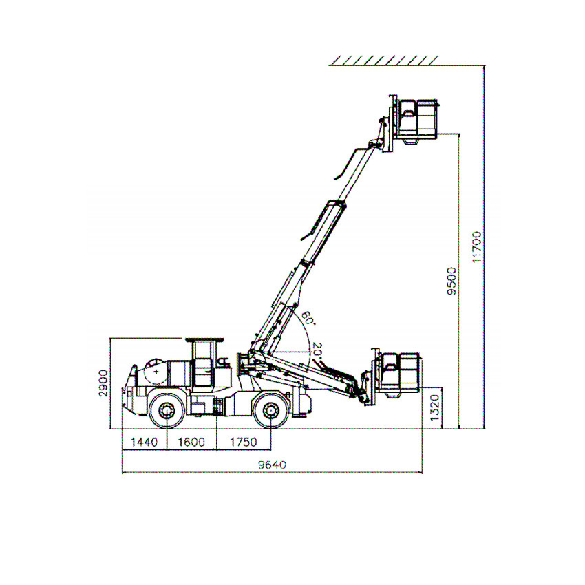 The MinLifter 795T Evolution is a four-wheel drive, two-arm aerial work platform with articulated steering, each arm having a lifting capacity of 750 kg and with a basket height above ground of 9.5 m.