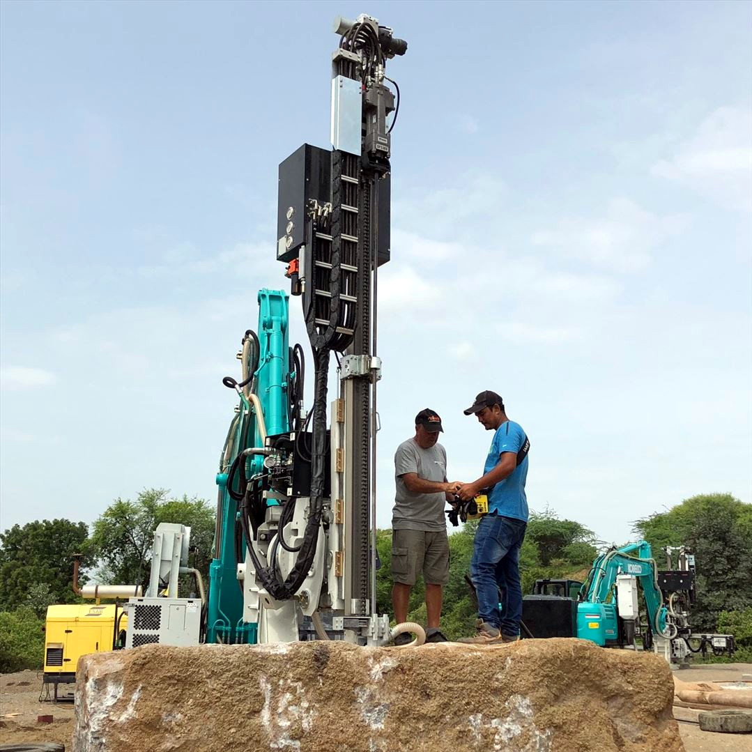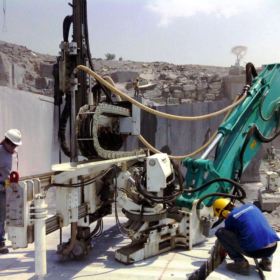 The particular kinematics allows you to drill holes in line with two drill rigs at a time allowing great performance.